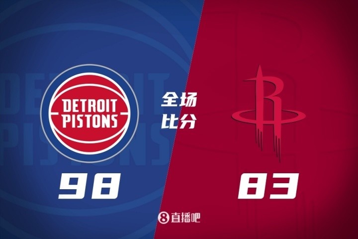 比赛开始,活塞率先发力,内外开花很快取得两位数领先,谢泼德中投破荒,活塞持续输出保持优势,次节谢泼德突然发力连得9分,火箭趁势追到只差2分,此后活塞迅速回暖,多点开花再获两位数优势,半场战罢活塞55-38领先火箭。易边再战,火箭频频冲击内线拿分追赶,活塞一波8-0强势回应,分差来到20分,霍兰强攻连中两球,活塞稳扎稳打保持大比分的领先,火箭大势已去无力回天。最终,活塞98-83轻取火箭。