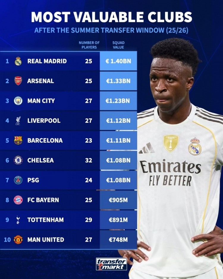 9月3日讯 德国转会市场统计了夏窗结束之后各俱乐部的球员身价,并列出榜单,皇马14亿欧居首,阿森纳、曼城二三位,曼联7.48亿欧排名第10位...