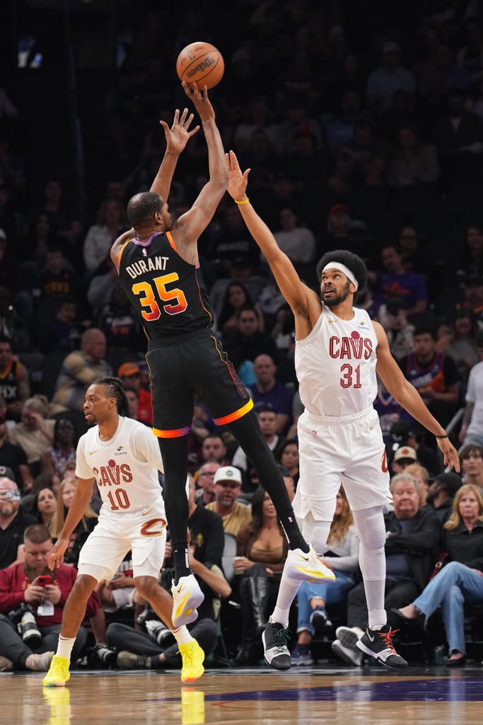太阳下半场继续点名军训骑士的防守弱环,杜兰特挡拆点名米切尔和斯特鲁斯单打,无差别中距离单打骑士最好的防守者莫布里;布克也点名米切尔和加兰,骑士单防压力巨大,无奈采用了联防,但被吉莱斯皮和邓恩大空位三分射穿,太阳一度建立起20分领先优势。