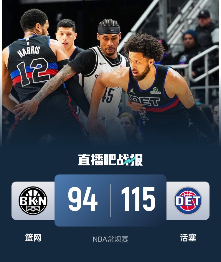 比赛上来,场上就呈现出一边倒的局势,篮网在半节的时间里只拿到4分,而活塞这边杜伦统治了攻防,在他的带领下球队也是打出19-4的完美开局,比斯利上场后连中三分,活塞单节轰下39分,次节活塞依旧占据着场上的主动权,分差也是突破了二十分,半场结束时篮网落后23分;下半场回来,活塞的进攻出现大问题,单节只拿到13分,尤其是三节节末连续出现失误被篮网追到个位数,末节活塞重整旗鼓,双方也是火药味十足,比斯利挑衅观众被驱逐,不过分差一直在十分以上,最终活塞轻取篮网,送给后者四连败。