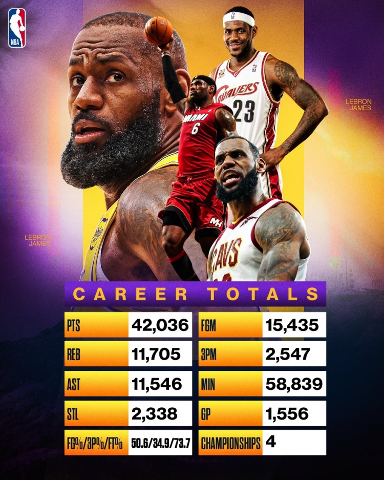 詹姆斯生涯至今42036分11705篮板11546助攻2338抢断,投篮命中数15435,三分命中数2547,出战1556场共58839分钟,三项命中率50.6/34.9/73.7%,总冠军4个!