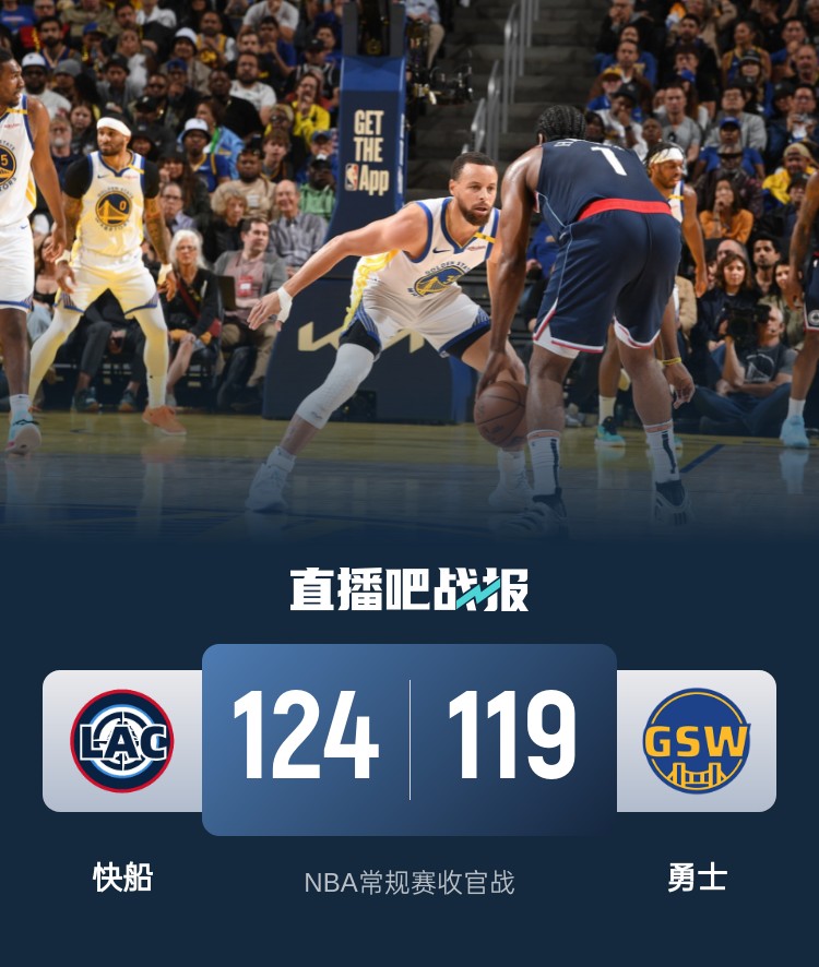 开场后哈登和莱昂纳德帮助快船抢占先机,库里早早领到2次犯规下场休息,第一节后半段快船进攻断电,勇士在巴特勒带领下打出11-0的攻势将比分反超。第二节上来勇士依旧延续不错的防守,虽然自己进攻打得也不理想,但还是保持领先优势。第二节尾声快船外线找到手感连中三分,虽然库里回应两记三分,但鲍威尔压哨超远三分命中帮助快船领先2分结束上半场。易边再战,勇士率先打出攻势完成反超,哈登立马站出来连续拿分帮助快船夺回领先,随后两队你来我往陷入僵持。第四节库里站出来连续拿分,一度帮助勇士反超比分,但快船总能及时回应,莱昂纳德绝杀不中,两队常规时间打平进入加时。加时赛中哈登上来连中两记三分,勇士多次追分续命,但格林关键上篮没有打进,勇士只得采用犯规战术,莱昂纳德三分不中,希尔德抢投三分不中,最终快船加时124-119力克勇士豪取8连胜,勇士掉入附加赛区排名第七。