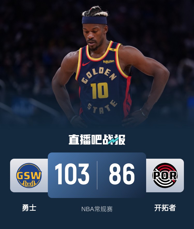 此役一上来两队稍显慢热,希尔德外线率先开张连中三分,勇士末段发力轰出12-0攻击波后来居上,首节结束时勇士领先6分,次节回来,开拓者进攻依然滞涩,巴特勒连造杀伤罚球取分,库里和希尔德外线续上火力,半场战罢,勇士将优势扩大到13分。易边再战后勇士进攻出现停滞,沃克连投带罚率队追分,巴特勒杀伤内线稳住局势,三节结束后勇士已经领先20分,末节上来,开拓者进攻乏力追分无望,勇士率先换上替补阵容,最终勇士103-86大胜对手。