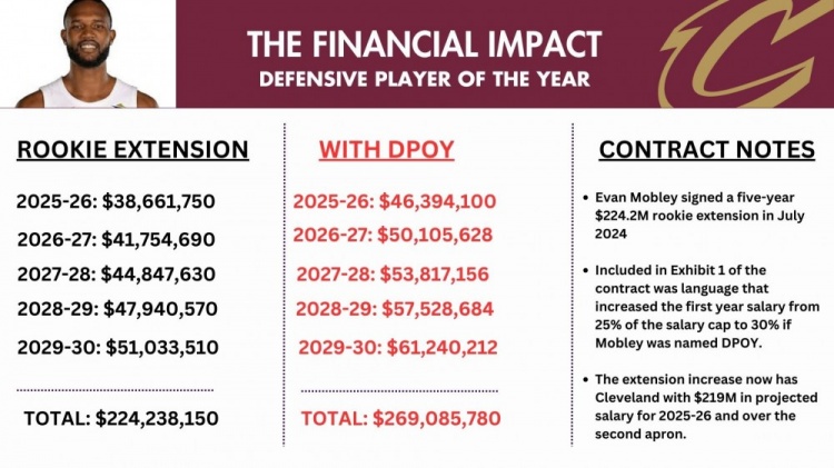 埃文-莫布里去年和骑士达成5年2.24亿美元的顶薪提前续约合同,因拿下最佳防守球员,他的这份续约合同将涨至5年2.69亿美元,涨薪4500万!