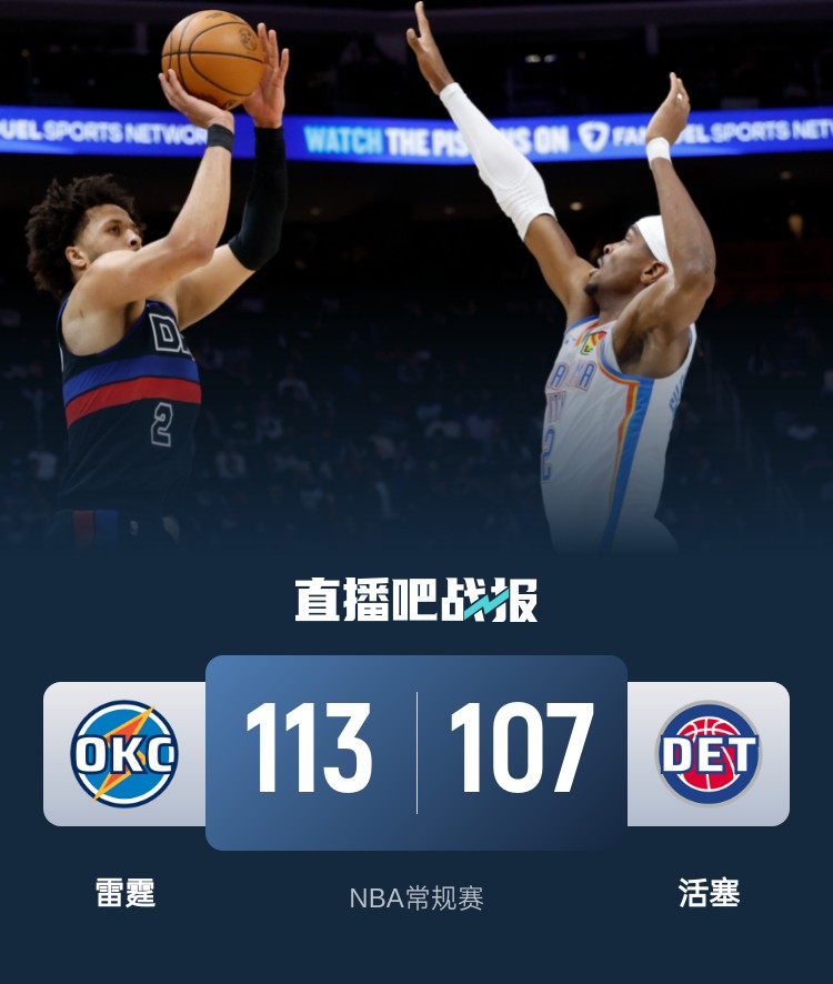 比赛上来,雷霆就率先进入状态取得领先,多特命中三分后分差也是达到了两位数,好在活塞此后连拿六分完成止血,次节前两分钟雷霆一直没有得分,活塞一波9-0的小高潮完成反超,并且他们也建立起十分以上的领先优势,不过亚历山大此后站了出来带队追分,半场结束时雷霆反超1分;下半场回来,雷霆攻势如潮完全占据了场上的主动权,不过多特受伤提前离场,而活塞这边康宁汉姆不满判罚被驱逐,末节雷霆命中率下降明显,活塞将比分追了回来,不过他们还是没能完成反超,亚历山大连续得分稳住局势,最终雷霆力克活塞迎来连胜。