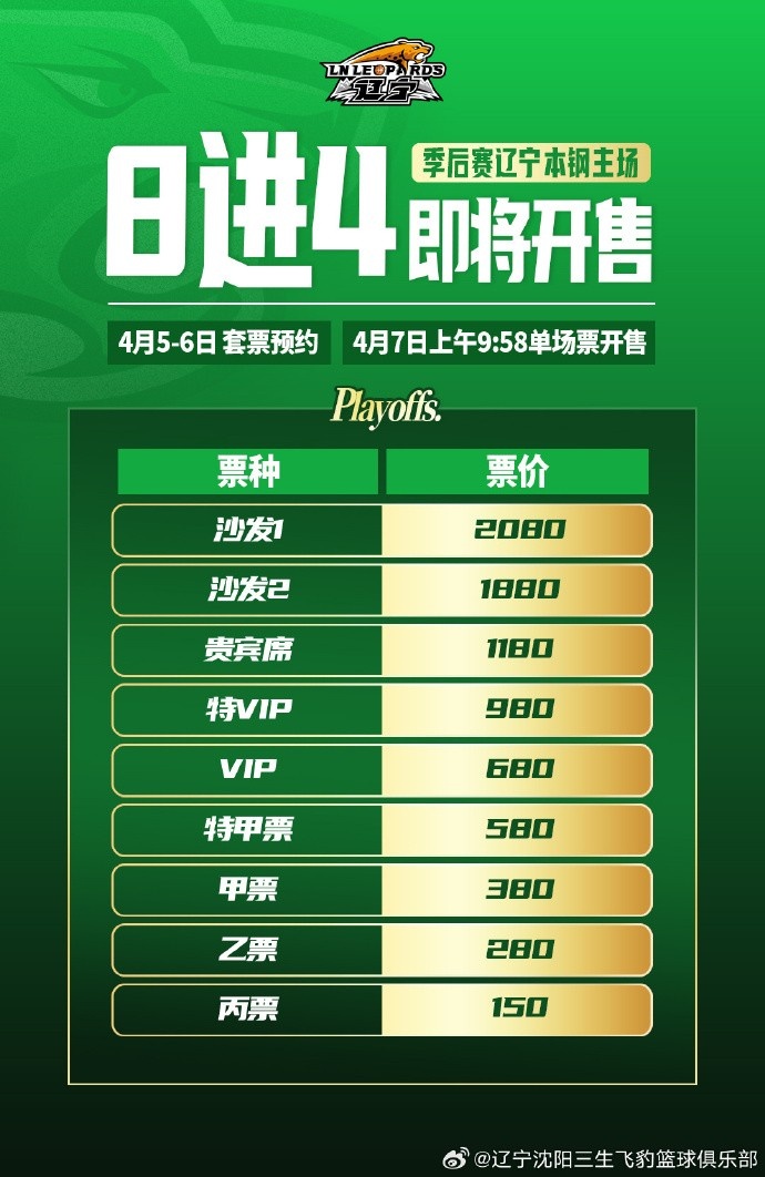辽篮季后赛球票7号开售 最低150元 沙发座1880&2080两档