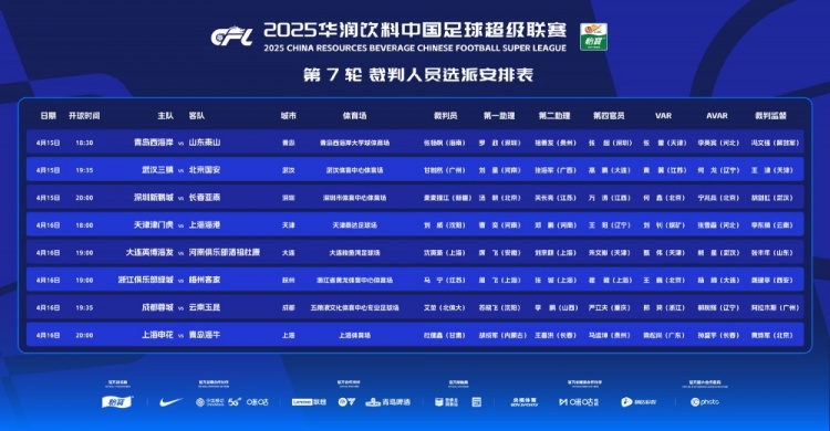 中超第7轮裁判:马宁执法浙江vs梅州 张雷担任西海岸vs泰山VAR