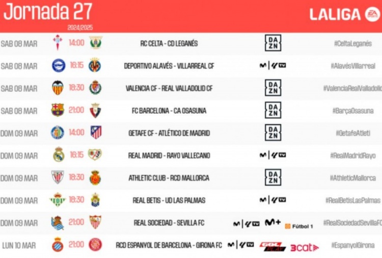 西甲公布联赛第27轮比赛时间:巴萨、皇马和马竞均在3月9号出战