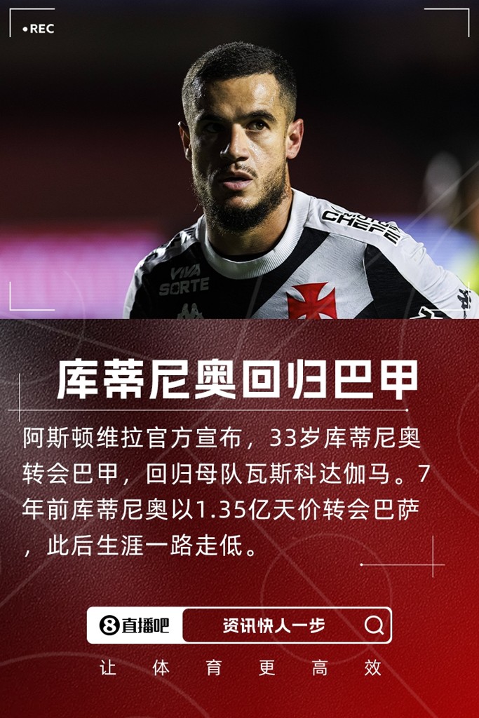 7年前卖了1.35亿!维拉官方:33岁库蒂尼奥转会巴甲瓦斯科达伽马
