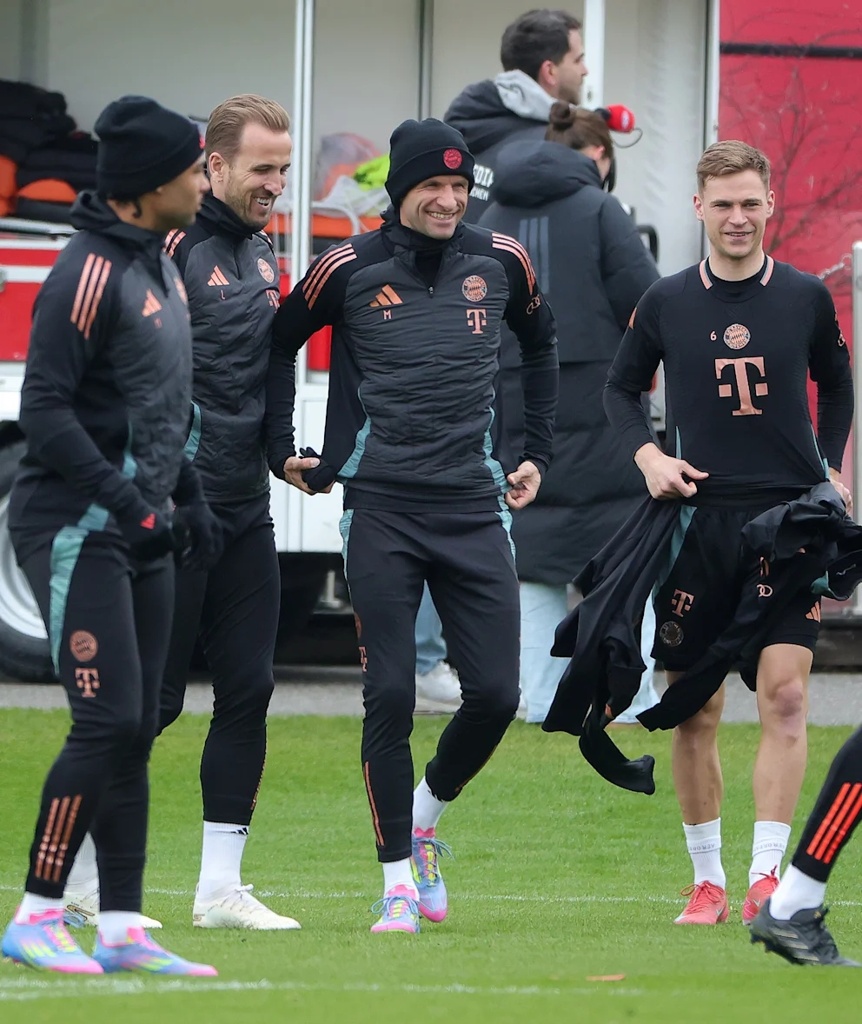 穆勒与基米希一起进入球场。他戴着帽子,气温只有4摄氏度,此刻没有下雨。穆勒的心情很好,正在和队友开玩笑。