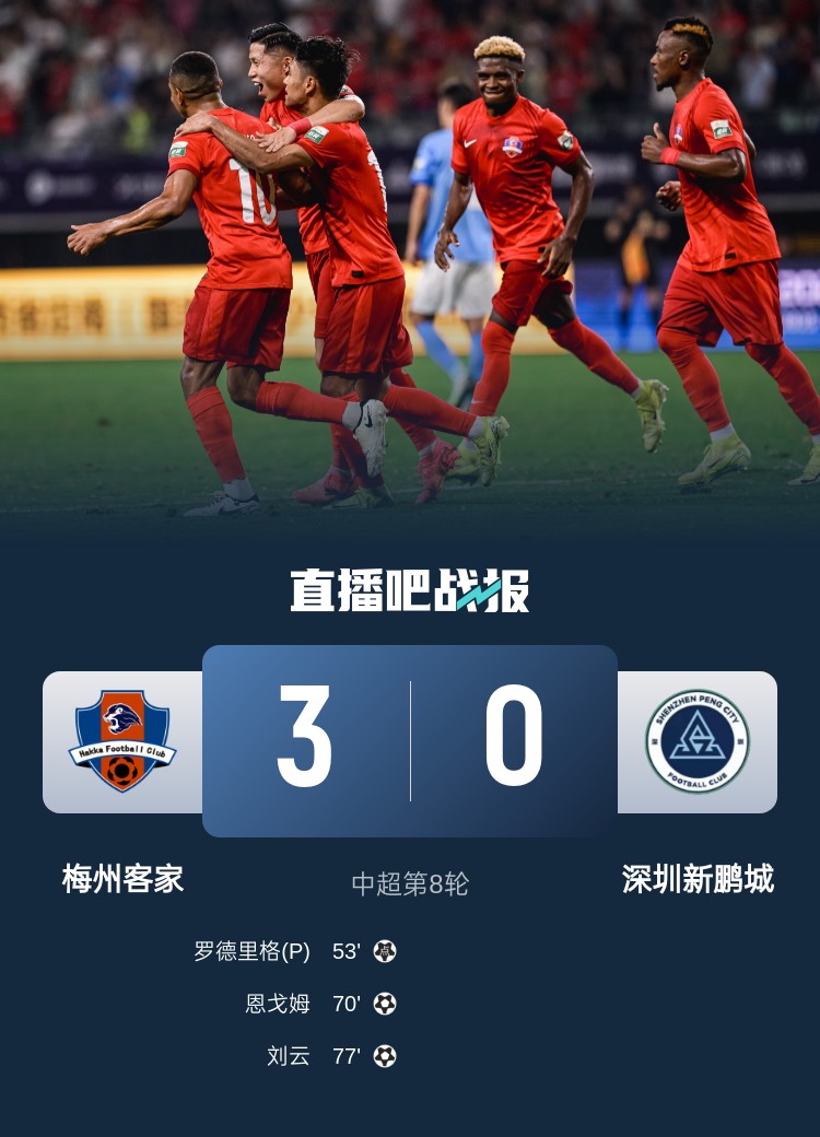 全场比赛结束,梅州客家3-0深圳新鹏城。