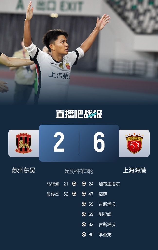 5月21日讯 北京时间19:30,足协杯第3轮苏州东吴vs上海海港,比赛在苏州体育中心体育场打响!上半场,马辅渔独闯龙潭精彩挑射破门!李新翔助攻加布里埃尔扳平!下半场,茹萨爆抽破门;吴俊杰扳平比分;古斯塔沃、蒯纪闻连下两城!亚热马提破门被吹;蒯纪闻助攻完成传射,古斯塔沃破门双响!补时阶段,李圣龙头球破门。最终,海港6-2战胜苏州东吴,晋级足协杯第4轮!