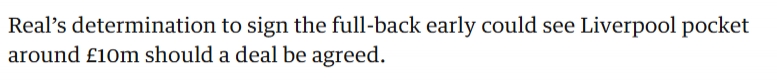 Real’s determination to sign the full-back early could see Liverpool pocket around £10m should a deal be agreed.