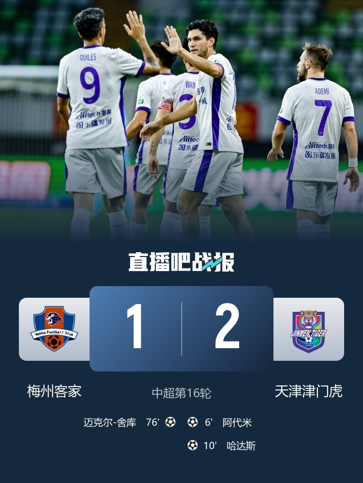 全场比赛结束,津门虎2-1战胜梅州客家。