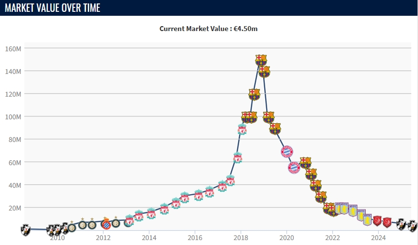 库蒂尼奥2018年以1.35亿欧转会费加盟巴萨,当时库蒂尼奥效力巴萨后的巅峰身价高达1.5亿,如今库蒂尼奥身价一降再降,仅有450万欧。
