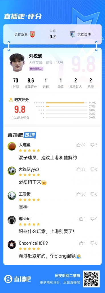 【】中超第五轮最佳球员:李源一!吧友评分9.9国产助攻王