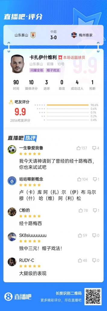 【】中超第18轮最佳球员评选出炉,卡扎伊什维利戴帽闪耀全场,帮助山东泰山3-0击败梅州客家,本赛季第二次当选中超每轮最佳。