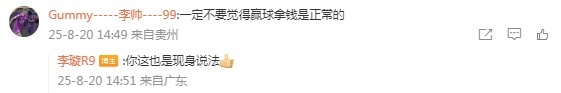 随后,李帅本人留言评论道:“一定不要觉得赢球拿钱是正常的。”