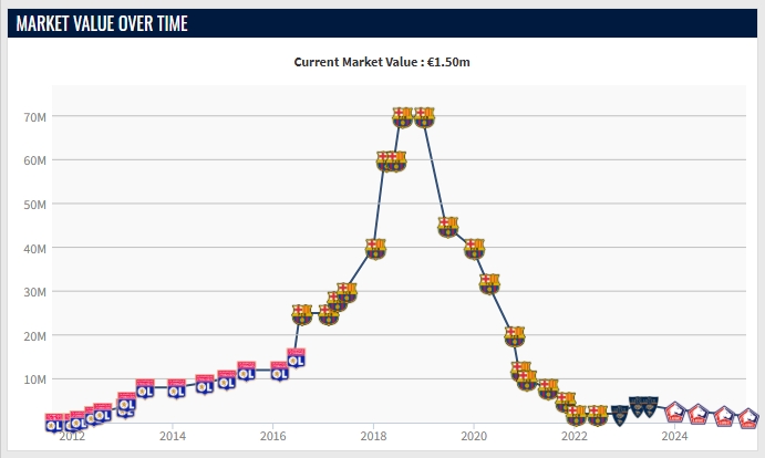 乌姆蒂蒂巅峰时身价高达7000万欧,如今只剩150万欧。