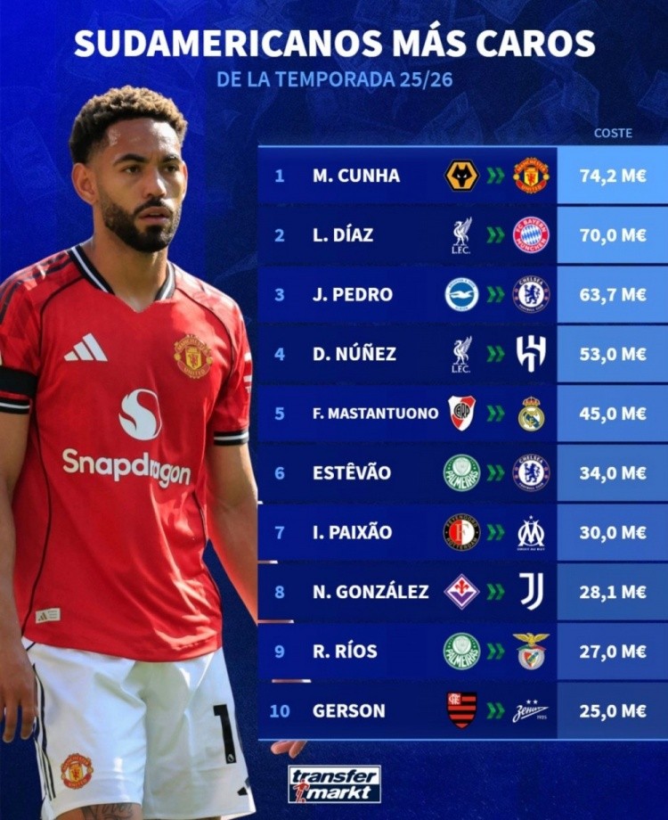 今年夏窗南美球员转会费榜:库尼亚7420万欧居首,迪亚斯次席