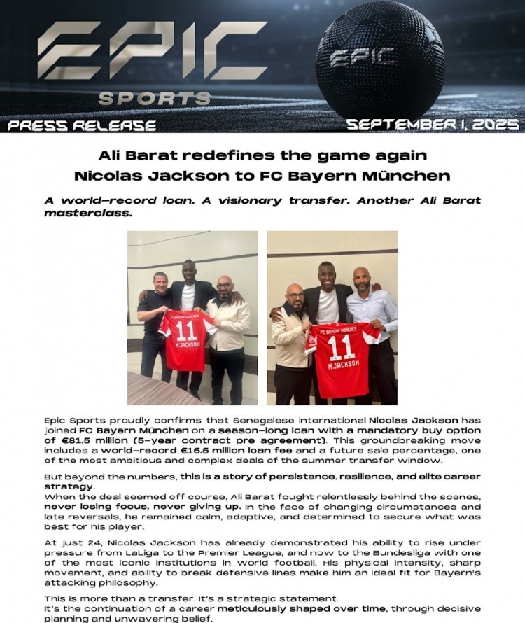 9月2日讯 杰克逊经纪人巴拉特的经纪公司EPIC SPORTS发文,狂赞杰克逊转会拜仁的交易。这笔租借交易可谓在夏窗的最后时刻一波三折,先是切...