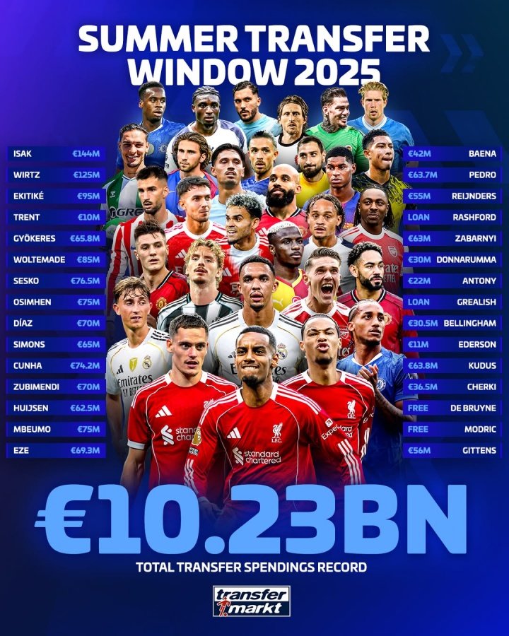 09月03日讯 德转发布海报,该机构统计表示,足坛今夏转会窗的总支出达到惊人的102.3亿欧。这个金额是足坛单个转会窗历史最高,一个世纪级...