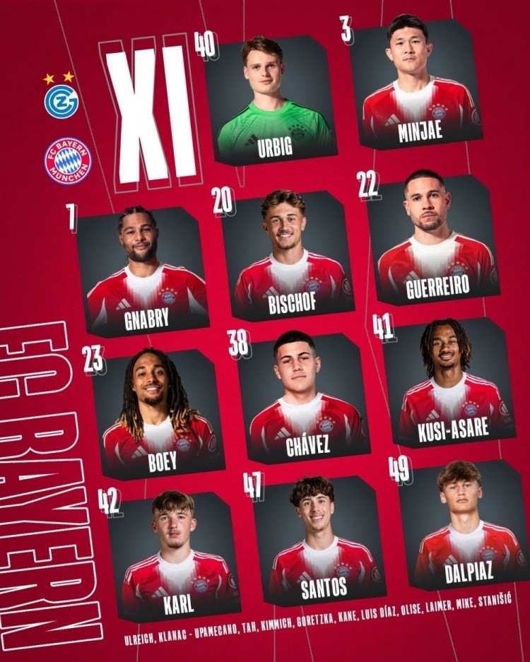 拜仁vs草蜢友谊赛首发:多名小将出战,凯恩、迪亚斯等人替补