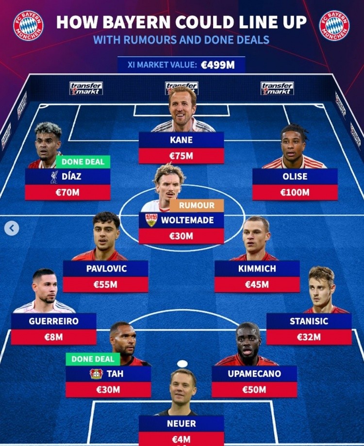 打几分?德转预测拜仁新赛季主力:前英超三叉戟+影锋沃尔特马德