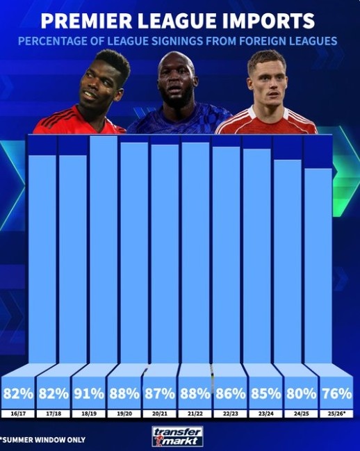 内部消化!英超俱乐部今夏从国外引援比例为76%,创近10年新低